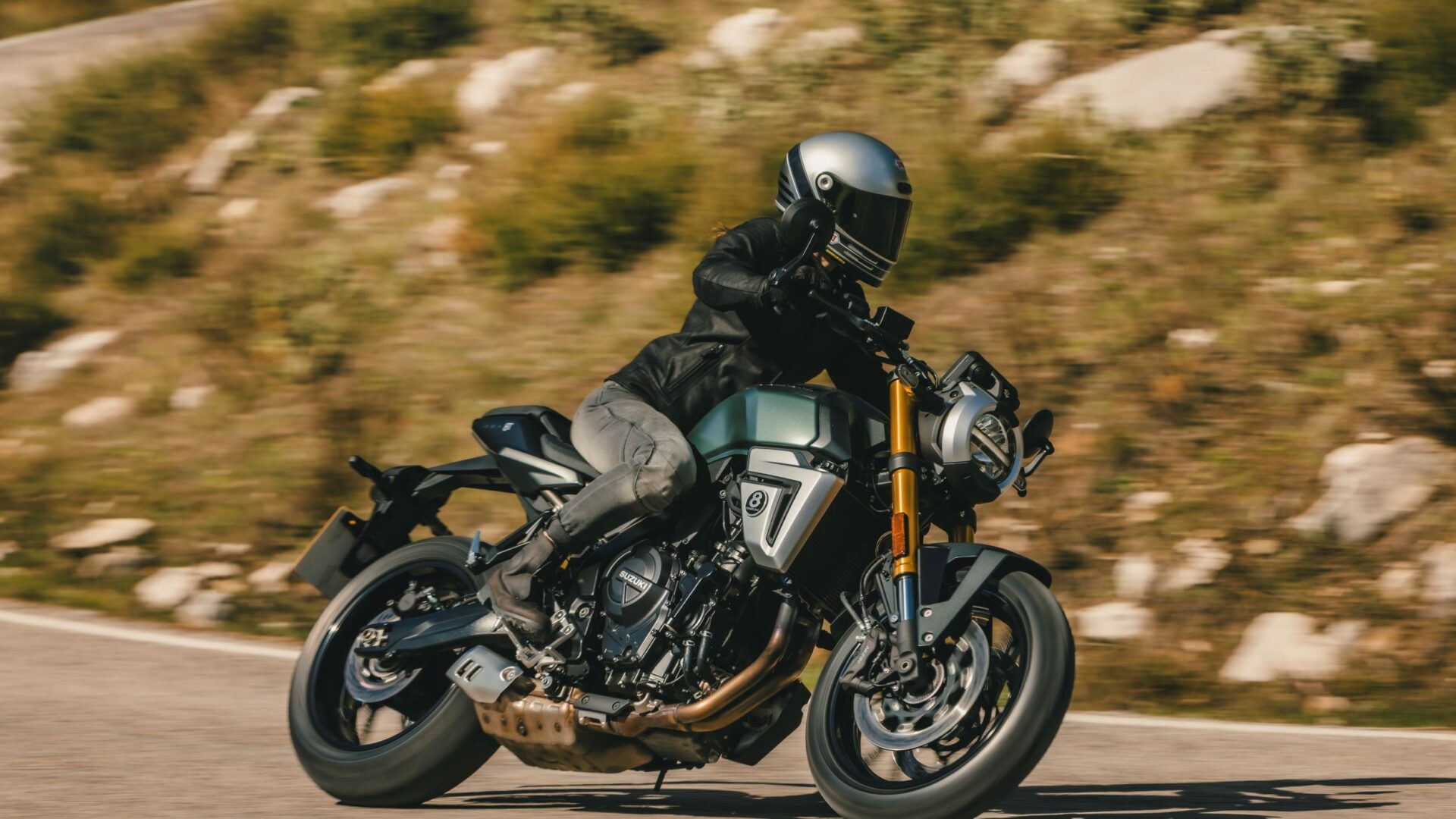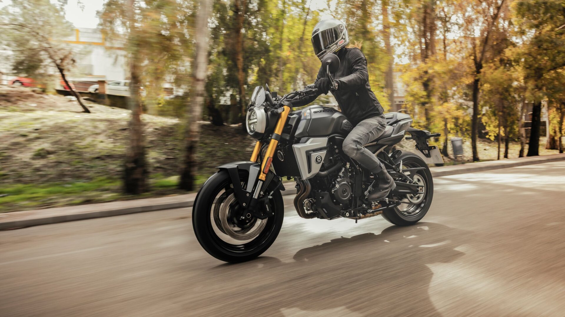 De Suzuki GSX-8T is een opvallende verschijning in het Street-segment. De ronde LED-koplamp, geïnspireerd op Suzuki-motorfietsen uit de jaren 60 en 70, is voorzien van geïntegreerde contourverlichting. Karaktervol design met een moderne twist: de iconische 16,5-liter tank, goudkleurige voorvork en luxe afwerking maken het plaatje compleet: met deze motor val je op. De GSX-8T onderscheidt zich verder door zilverkleurige radiatorkappen. Met een rond GSX-8-embleem – een subtiele knipoog naar de 8-ball, de belangrijkste bal in poolbiljart. De eerste Suzuki met bar-end spiegels, die het naked-bike karakter versterken en optimaal zicht bieden. Deze motor is ontworpen voor rijders die niet alleen topprestaties zoeken, maar ook trots willen zijn op hun machine. De GSX-8T is meer dan een motor – het is een statement.